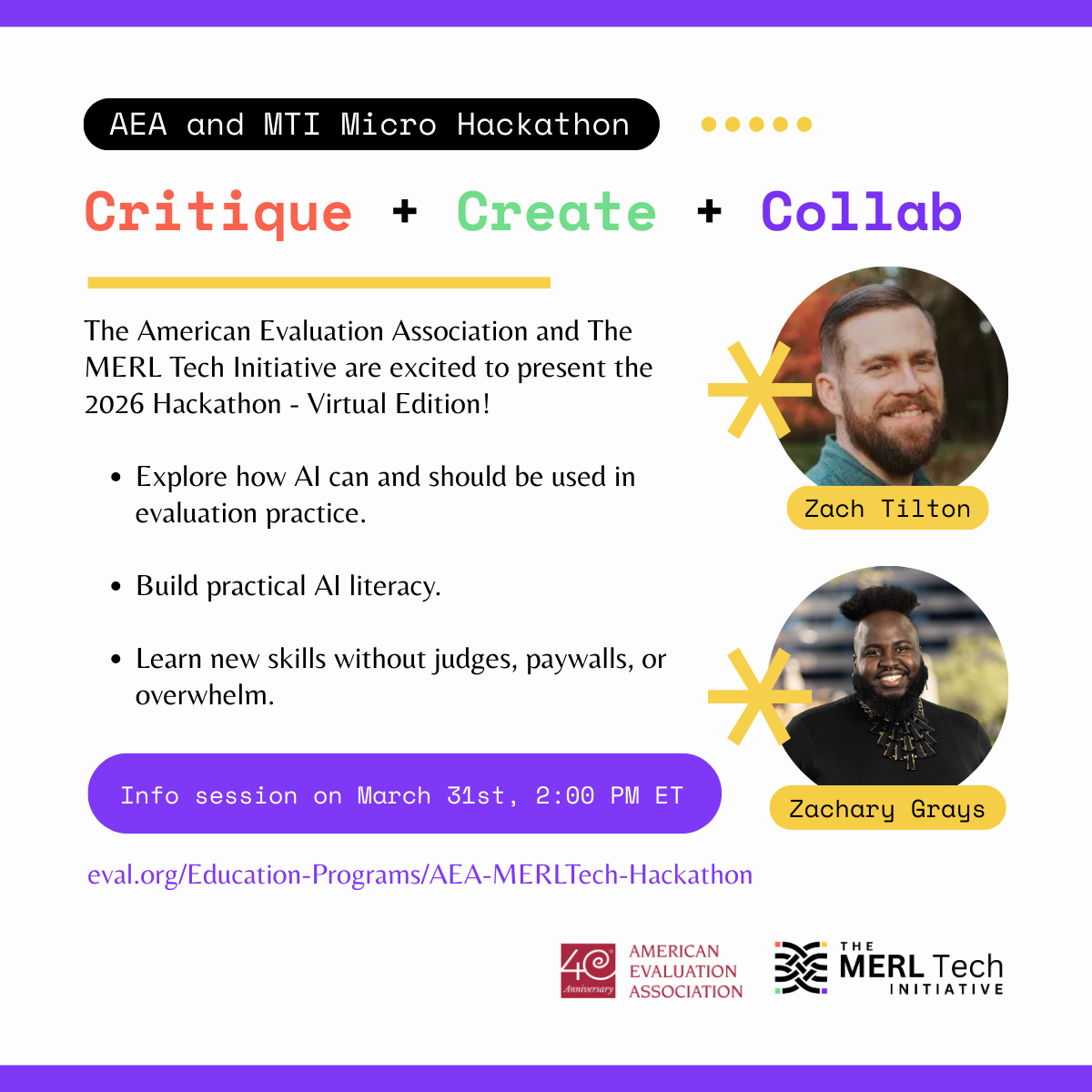 Back by popular demand, the American Evaluation Association (AEA) and The MERL Tech Initiative (MTI) are excited to present the 2026 Hackathon–Virtual Edition! This beginner-friendly hybrid hackathon challenges participants to create ethical AI-powered solutions for real-world evaluation problems. Everyone is invited to participate regardless of skill level or experience’